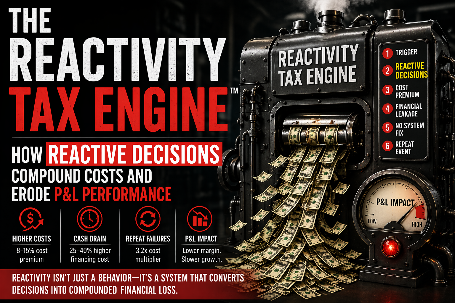 ▸ Exposes: the top 3 reactive trigger points generating the largest share of the Reactivity Tax — named, scored, and ranked by annual financial impact